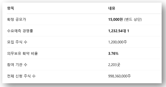 - 확정 공모가: 15,000원 (밴드 최상단)