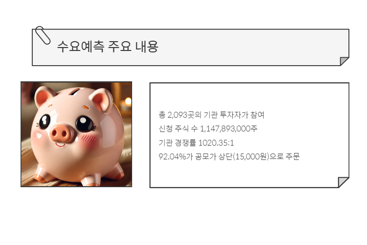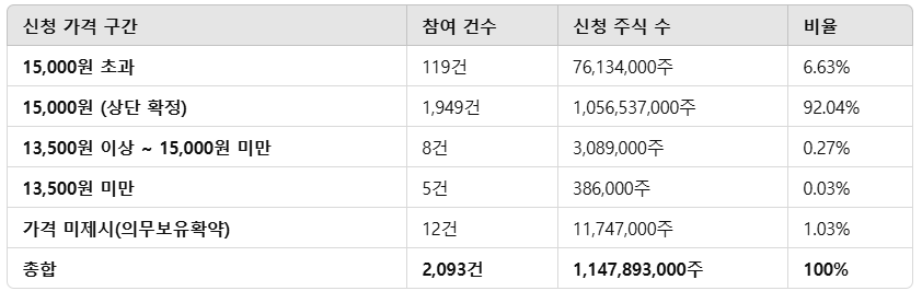 - 기관 투자자의 92% 이상이 공모가 상단(15,000원)을 선택