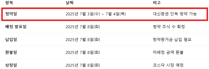 - 청약일: 7월 3일(수) ~ 7월 4일(목)