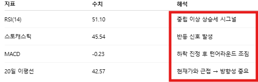 - MACD: 최근 ‘매도 신호’ → 하락 조정 구간에서 반등 시도 중