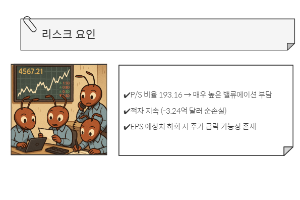- P/S 비율 193.16 → 매우 높은 밸류에이션 부담