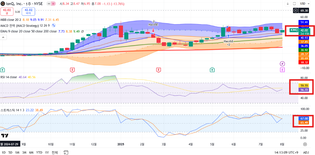 IonQ는 기술적으로 저점 반등 구간에 진입했으며, 아마존 투자 이슈로 모멘텀이 살아난 상태입니다. 하지만 **실적 발표(8월 6일)**가 임박한 만큼 단기 변동성 확대에 유의해야 합니다.