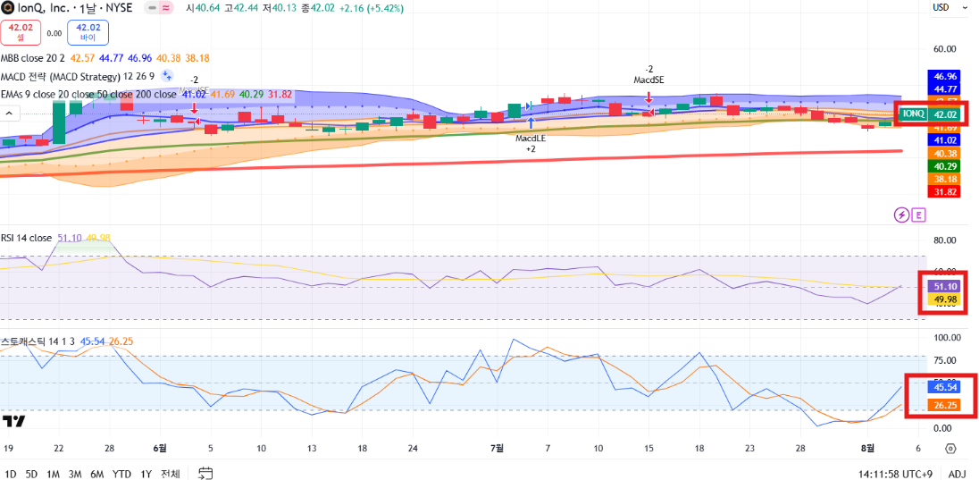 IonQ는 기술적으로 저점 반등 구간에 진입했으며, 아마존 투자 이슈로 모멘텀이 살아난 상태입니다. 하지만 **실적 발표(8월 6일)**가 임박한 만큼 단기 변동성 확대에 유의해야 합니다.