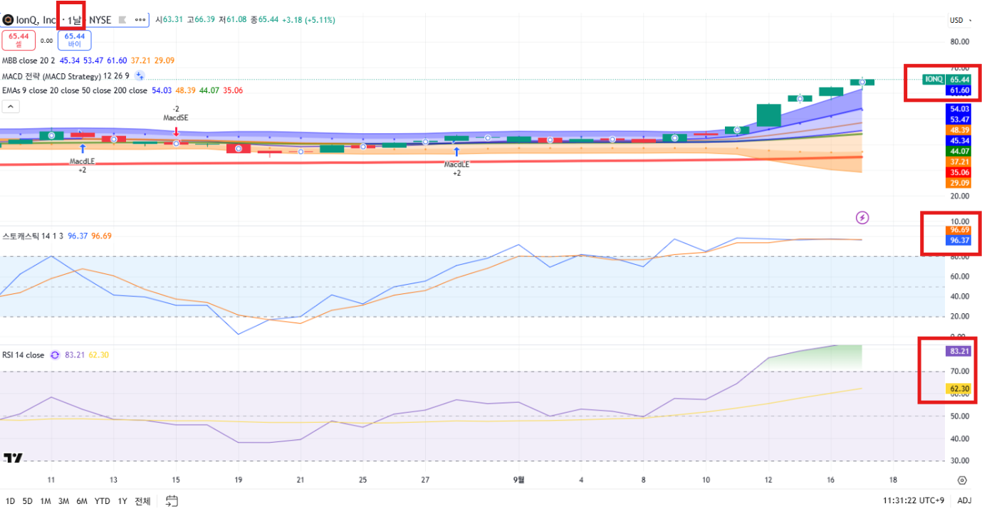 현재 과매수 구간이므로, 단기 조정은 유의하셔야 할 것으로 보입니다. 계속되는 급등은 없기 때문에 기간 조정 구간이 나올 수 있을 것으로 보이며, 현재 아이온큐는 장기적으로도 상승 추세 초입에 있으며, 강세 흐름이 명확하지만, 다만 단기 과열 구간에 진입했기 때문에 눌림목 조정이 나온다면 매수 기회로 활용할 수 있을 것으로 보입니다!