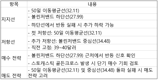 - 매도 관점: 50일 이동평균선(32.11)과 볼린저밴드 중심선(34.48)을 돌파하지 못할 경우 단기 매도 전략 고려.