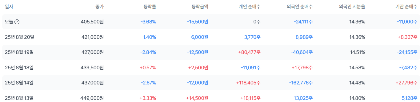 - 8/21: 외국인 -24,111주, 기관 -11,000주 순매도