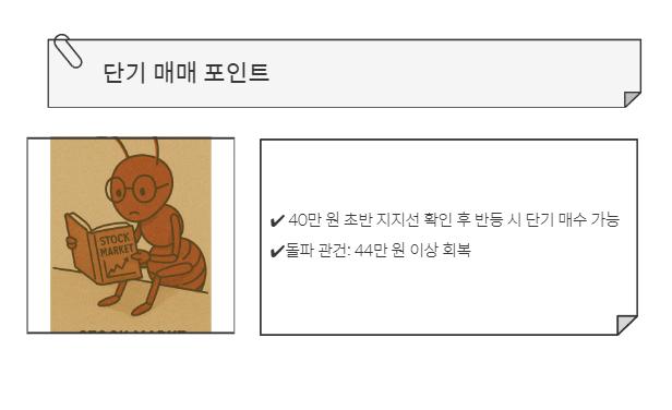 - 40만 원 초반 지지선 확인 후 반등 시 단기 매수 가능