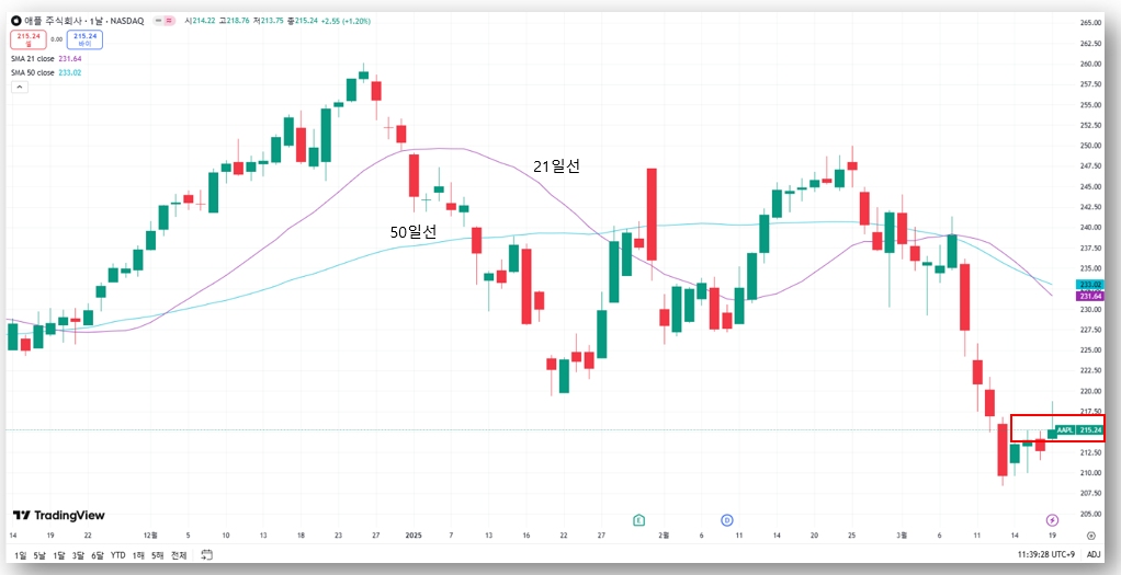- 이는 단기적으로 주가가 하락세에 있으며, 반등하려면 230달러 이상으로 올라야 하는 상황
