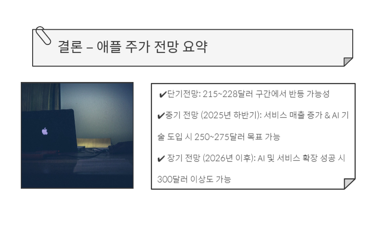 대부분의 애널리스트들은 애플 주가가 장기적으로 상승할 것으로 전망하고 있으며, 서비스 사업과 AI 기술이 핵심 성장 동력이 될 것으로 보고 있습니다.