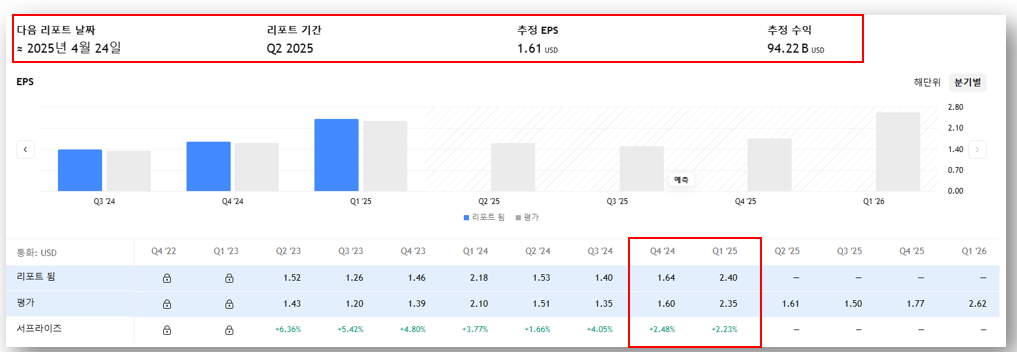 - Q1 2025 예상 EPS: 2.40달러 (전년 대비 +6.66%)