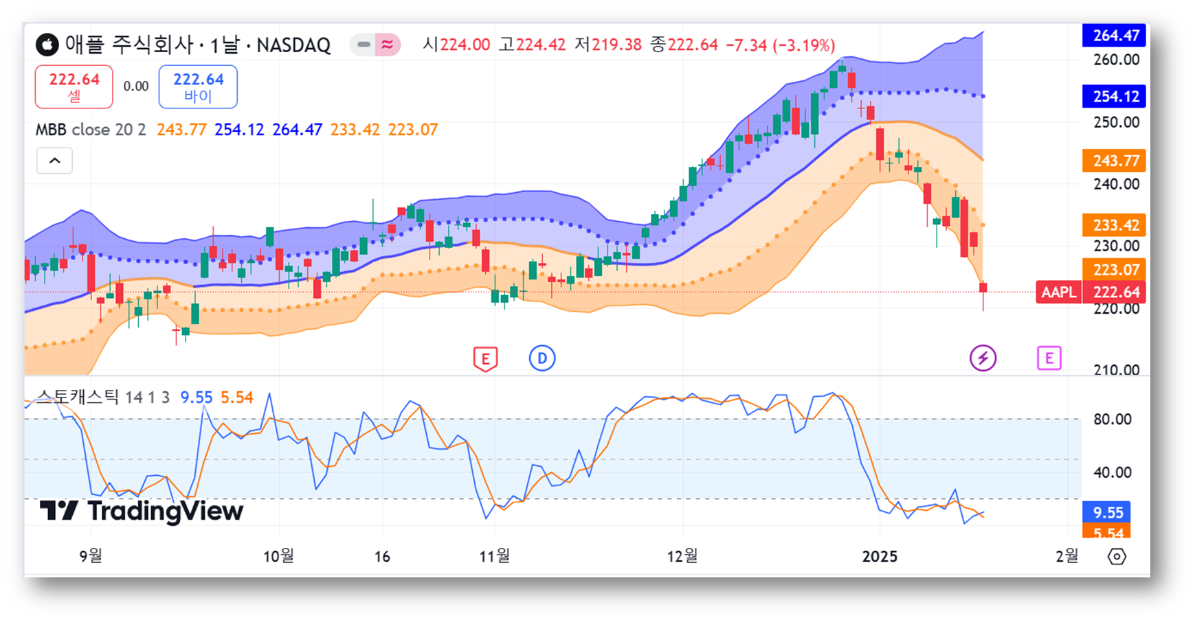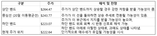 - 주가가 하단 밴드를 하향 돌파했으며, 단기 하락세가 강한데요, 주가가 하단 밴드($223.07) 근처에서 지지를 받을 가능성이 있으므로, 하락세가 둔화될지 확인해야 합니다.