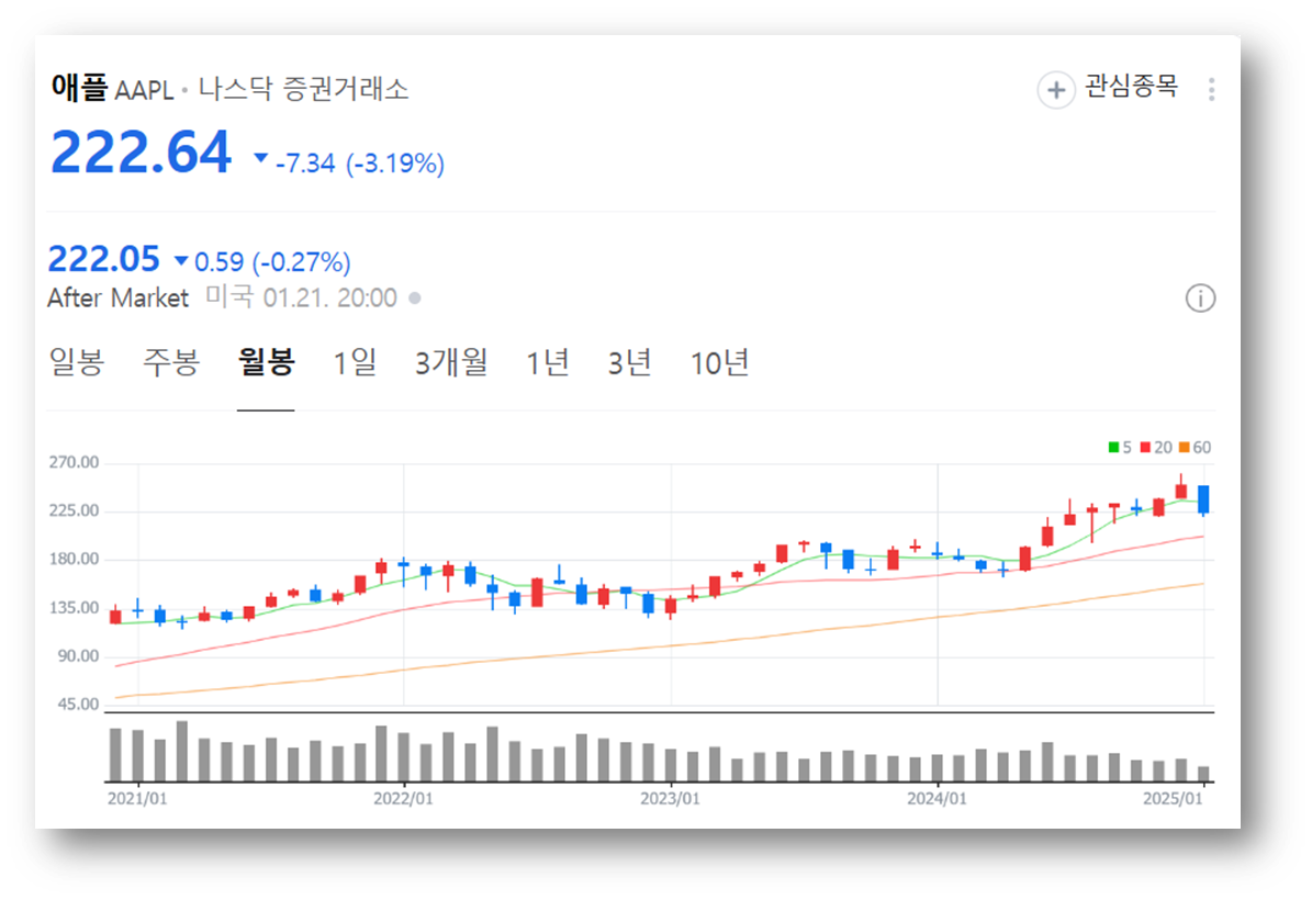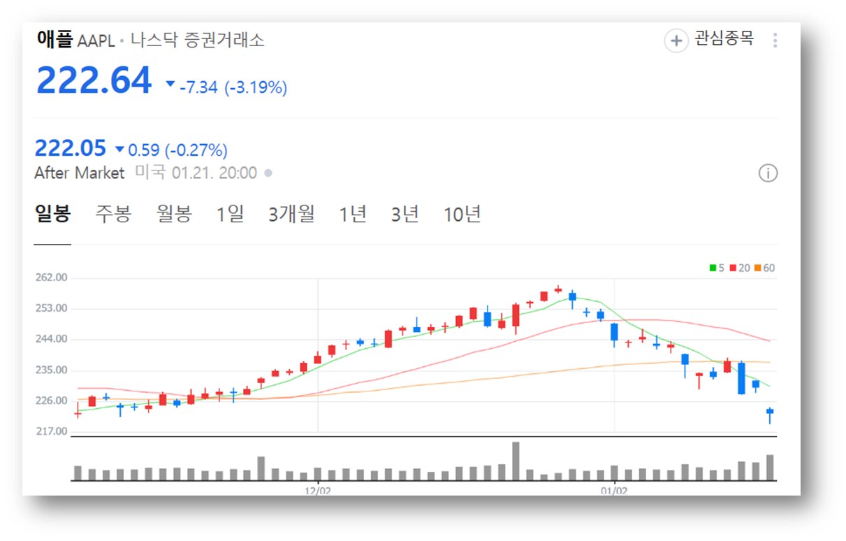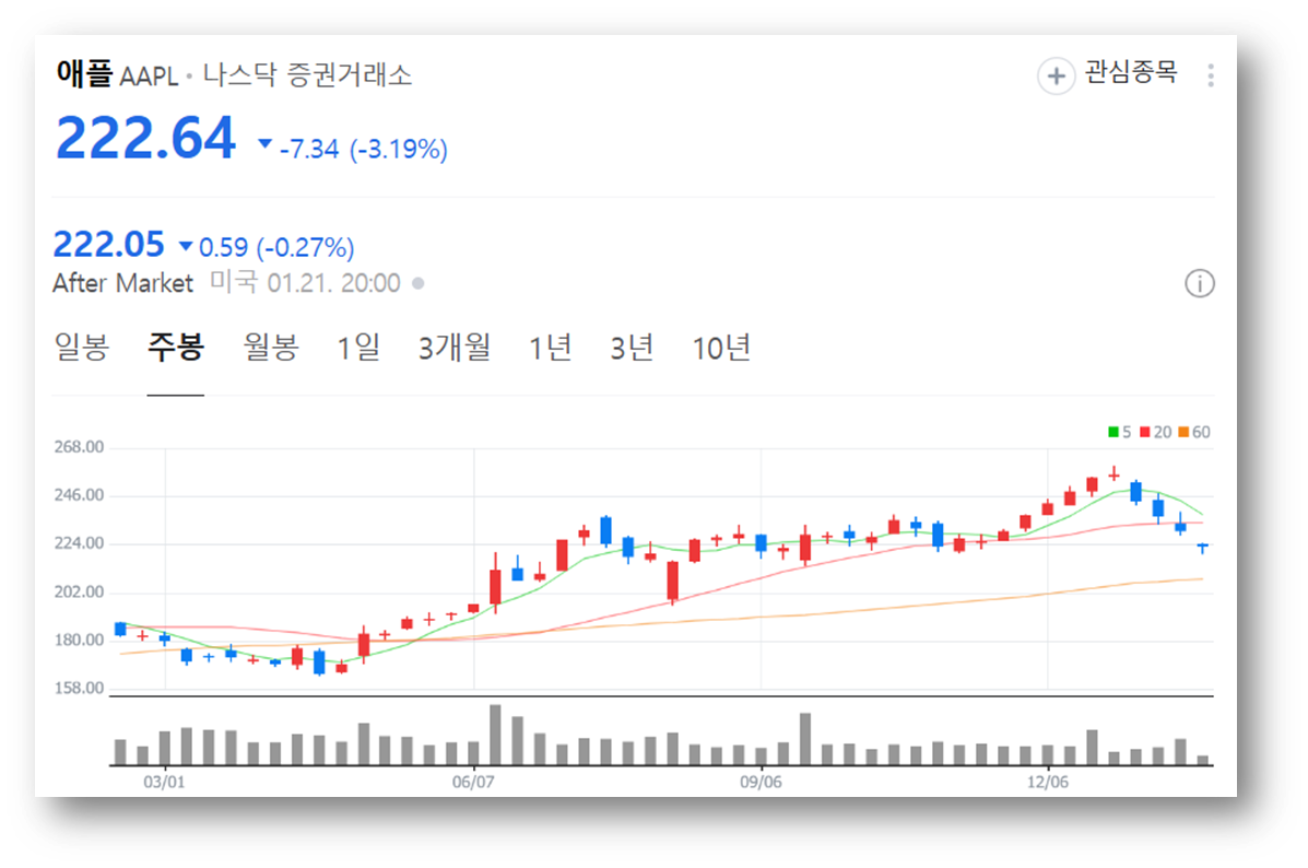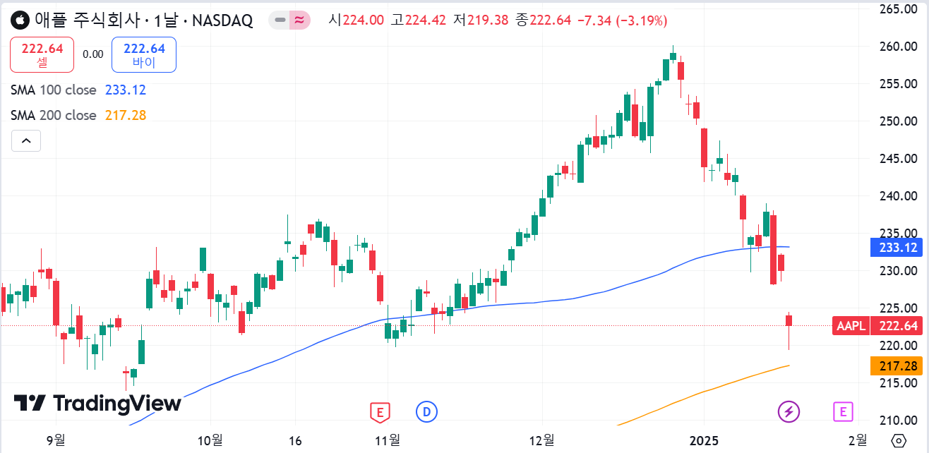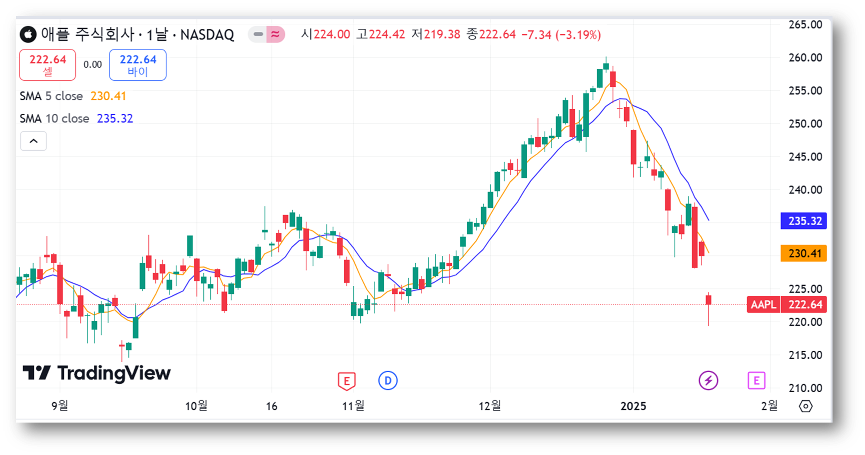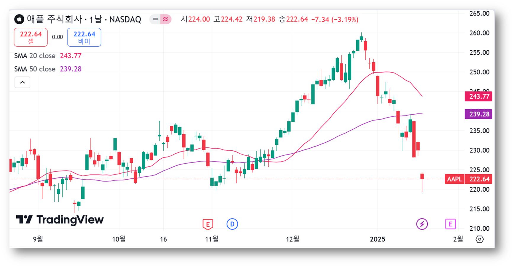 - 애플 주가는 현재 20일 이동평균선($243.24)과 50일 이동평균선($239.42) 아래에서 단기 및 중기 조정 국면에 있는 것으로 보이는데요, 200일 이동평균선($217.28) 부근이 장기적인 지지선 역할을 할 가능성이 높습니다.