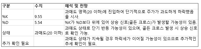 현재 스토캐스틱 값이 과매도 영역(20 이하)에 진입한 상태로, 주가가 단기적으로 과도하게 하락했음을 시사합니다.- %K가 %D보다 위에 있어 상승 신호(골든 크로스)가 발생할 가능성이 있습니다.