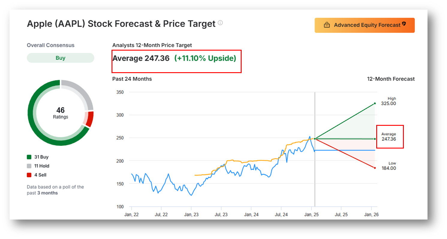 에플의 목표 주가는 평균 $247.36으로, 현재 주가 대비 약 11% 상승 가능성을 보이며, 최고 목표가는 $325.00으로 최적의 상황에서 약 46% 상승 가능성이 있지만, 최저 목표가는 $184.00으로 최악의 경우 약 17% 하락할 가능성도 있는 걸로 나타났습니다.