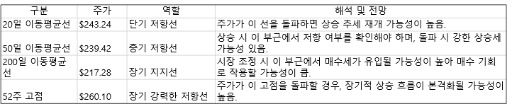 - 주가가 상승 추세로 전환될 경우, $260.10 부근에서 강력한 장기 저항선 역할을 할 가능성이 있습니다.