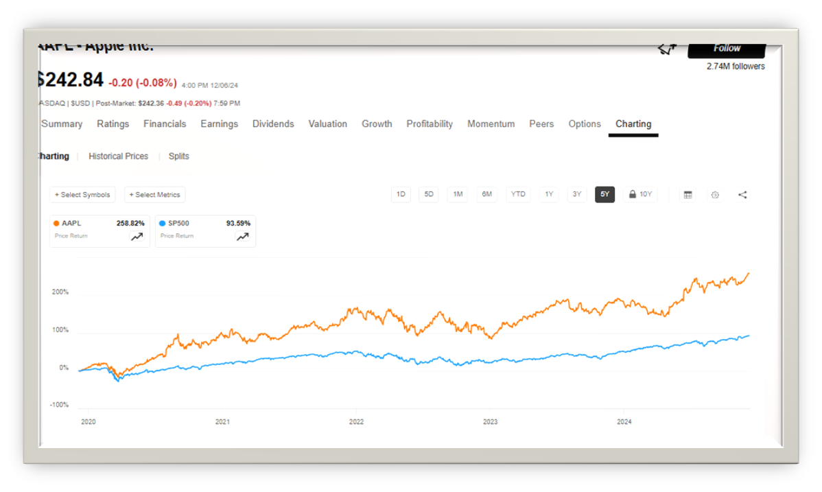 아래쪽 파란 선이 S&P 500 지수이고, 주황색 선이 애플 주가인데요, 지난 5년 동안 S&P 500와 상승 곡선을 같이 했으며, 애플의 경우, 지난 5년동안 258.82% 의 성장률을 보여주었네요. 1년 동안 상승률은 26.27% 정도로 S&P500 성장률이 33.87%였던 것에 비해 살짝 아쉽지만 미국을 대표하는 시총1위 기업의 위엄을 계속 보여주고 있습니다.