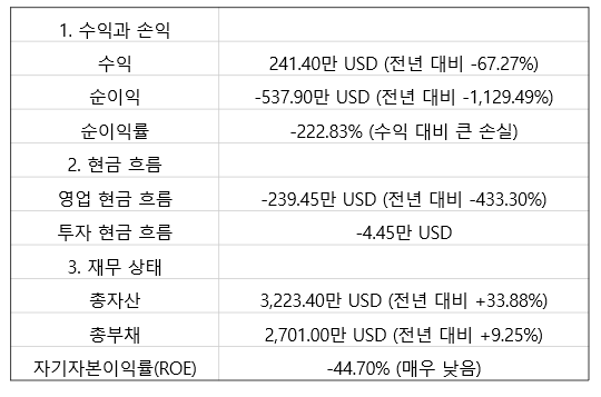 - 순이익: -537.90만 USD (전년 대비 손실 폭 증가, -1,129.49%)
