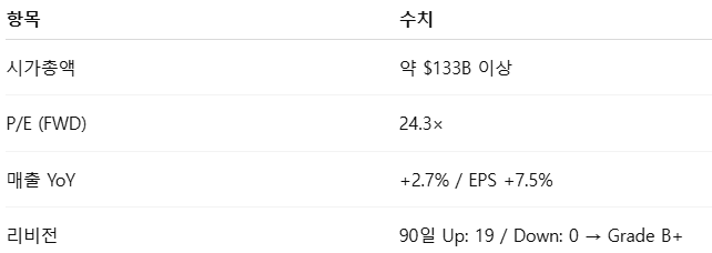 - 연간 FCF >$13.5B 유지 전망 / 배당 약 2.5%
