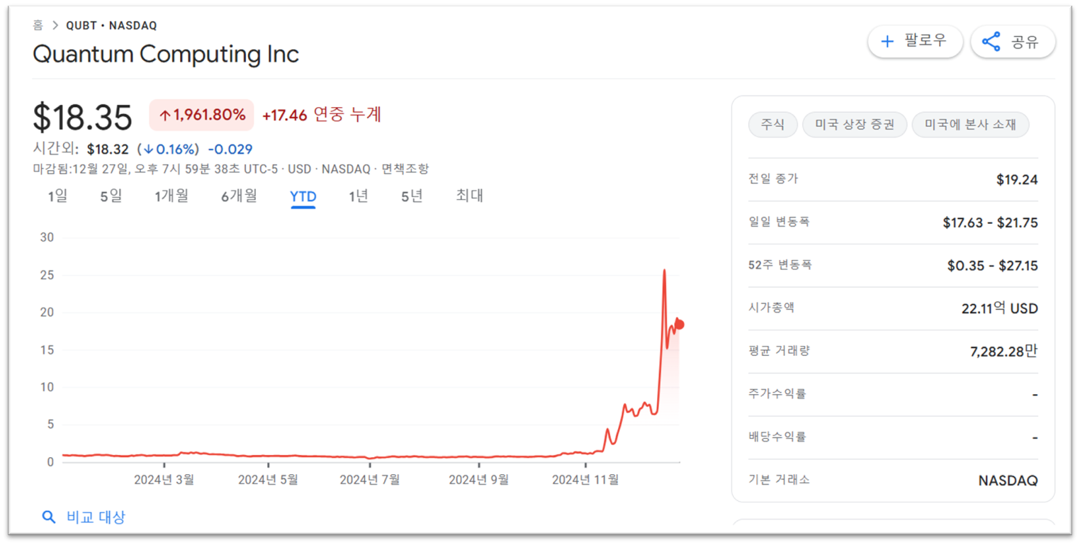 | 시장 변동성 | QUBT는 소형주로, 주가 변동성이 매우 큼. 최근 52주간 주가는 $0.35에서 $27.15까지 급등락을 경험 | 단기 투자자는 고위험에 노출될 수 있으며, 신중한 전략 필요 |