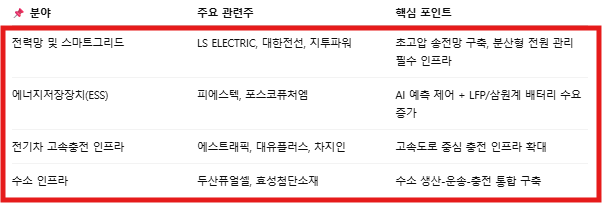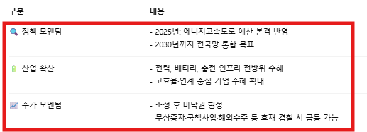 - 전력/배터리/충전 인프라 기업 모두 연쇄 수혜