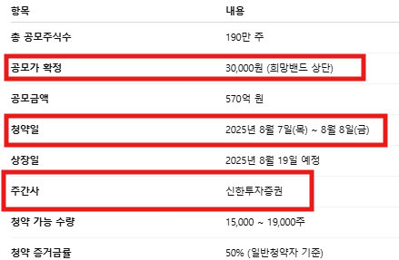 공모가는 희망밴드 상단인 30,000원에 확정되었고요, 청약일은 8.7~8.8입니다. 신한투자증권에서 청약 중입니다.