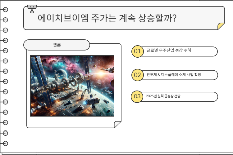 - 우주산업 성장 속에서 에이치브이엠의 사업 확장 가능성이 커짐.