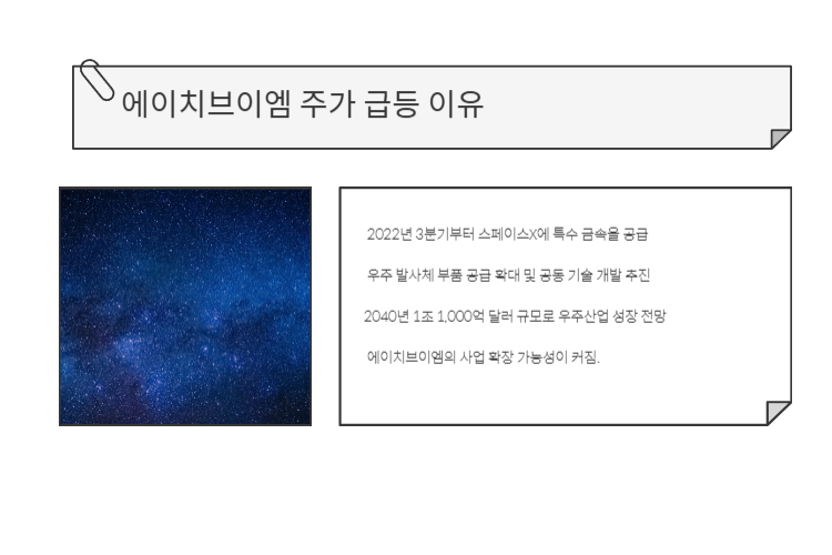 - 에이치브이엠은 2022년 3분기부터 스페이스X에 특수 금속을 공급하며 글로벌 우주산업 시장에서 입지를 다지고 있음.