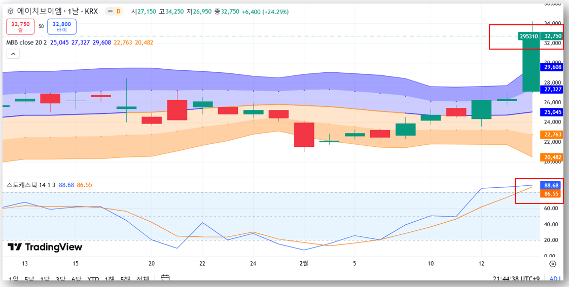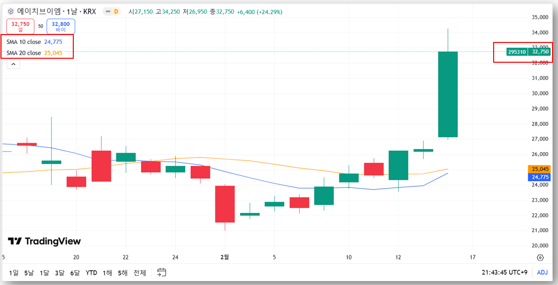 현재 에이치브이엠 주가는 강한 상승 모멘텀을 보이며 단기 급등했습니다.