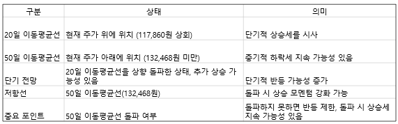 50일 이동평균선인 132,468원 부근이 저항선 역할을 하고 있는데요, 만약 이 선을 상향 돌파하지 못한다면 반등이 제한될 수 있습니다. 만약 50일선을 돌파할 경우, 상승 모멘텀이 강화되어 상승세를 이어갈 수 있어 보입니다. 따라서 주가가 50일 이동평균선을 돌파할지에 주목해야 합니다.