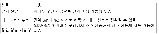 %K가 %D 위에 있어 매수 신호가 유지되고 있지만, 과매수 구간이기 때문에 신호가 약화될 가능성에 대비해야 합니다.