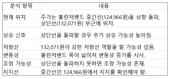 하지만 만약 주가가 상단선을 돌파하지 못하면 조정이 발생할 수 있으며, 중간선인 124,966원 부근에서 지지를 하는지 확인이 필요합니다.