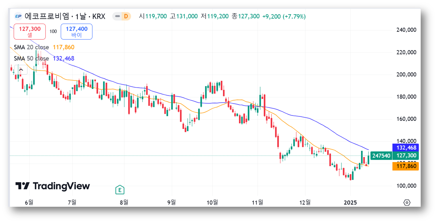 👉현재 주가는 127,600원으로 52주 최저가에 가까운 수준에서 거래되고 있는데요, 이는 주가가 지난 1년 동안 큰 하락세가 있었음을 알 수 있습니다.