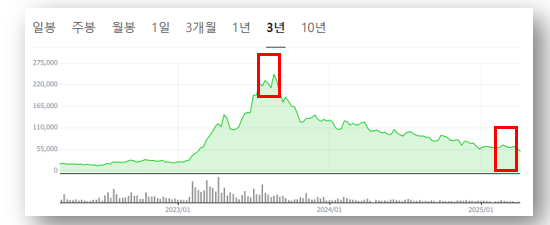 - 2023년 초 10만원대 → 급등 → 153만원(2023년 고점) → 하락세 전환