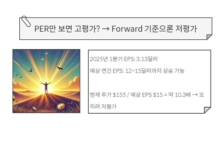 현재 주가 $155 / 예상 EPS $15 = 약 10.3배오히려 저평가