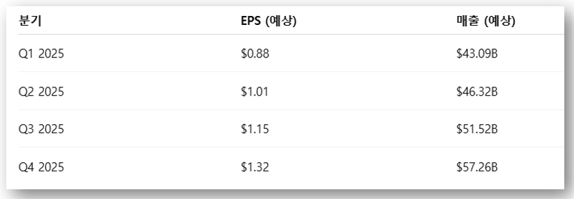 🔼 분기별 EPS 및 수익 예측 (2025년)