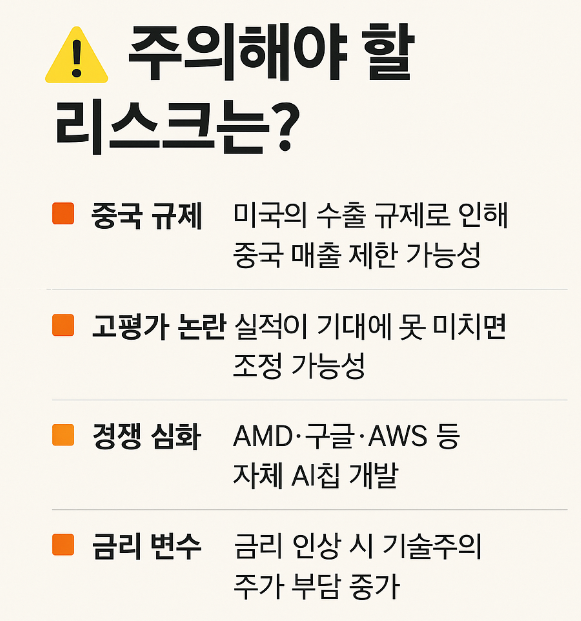 - 경쟁 심화: AMD·구글·AWS 등 자체 AI칩 개발