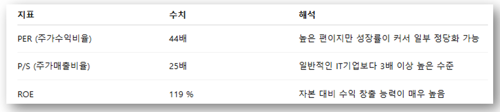 📌 투자자들은 “이익 성장률이 높기 때문에 프리미엄 밸류에이션이 정당화된다”고 보지만, 일부는 “거품이다”라고 경계합니다.