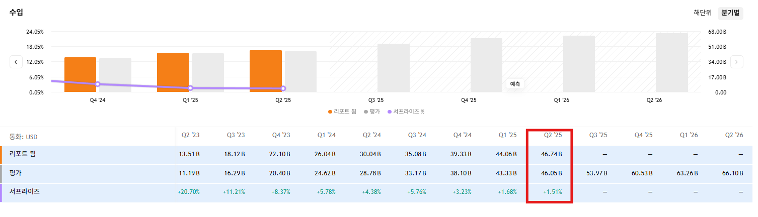• Q3 가이던스: 540억 달러(±2%) → 월가 예상치(531억 달러)보다 높음