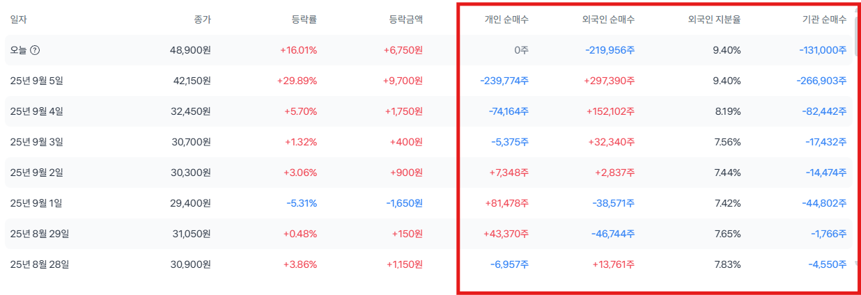 - 9/8(금일): 외국인 -219K, 기관 -131K (차익 실현성 매도)