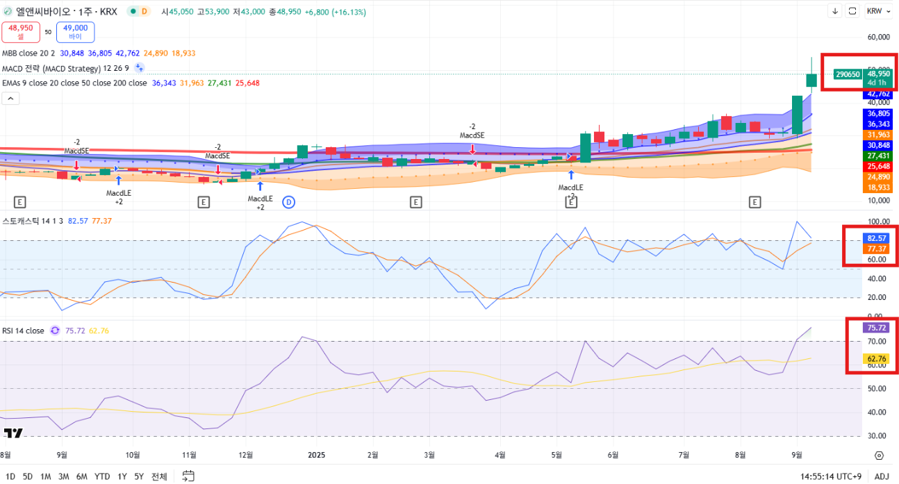 엘앤씨바이오가 상한가 기록 후,장대 양봉이 2거래일 연속으로 나타나며, 강한 상승 추세에 있습니다. 주요 이동평균선 모두 정배열 되어 있으며, 좋은 흐름을 보이고 있습니다. 하지만 단기 과열 구간에 진입했기에 신규 매수에는 조심하시는 것이 좋을 거 같아요.