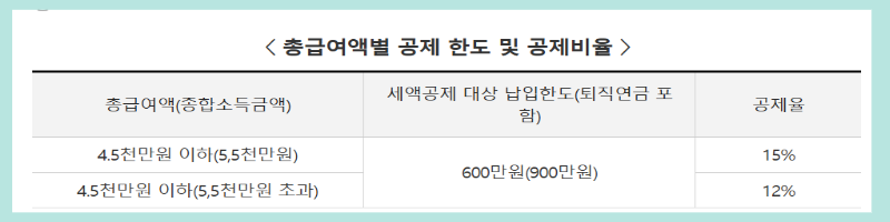 | 총급여액 4,500만원 이하 | 15% | 600만원 X 15% = 90만원 |