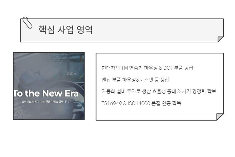 오리엔트정공은 자동차 변속기 및 엔진 부품을 전문적으로 생산하는 기업으로, 현대차와의 협력 관계 강화를 통해 꾸준한 성장을 이어가고 있다.