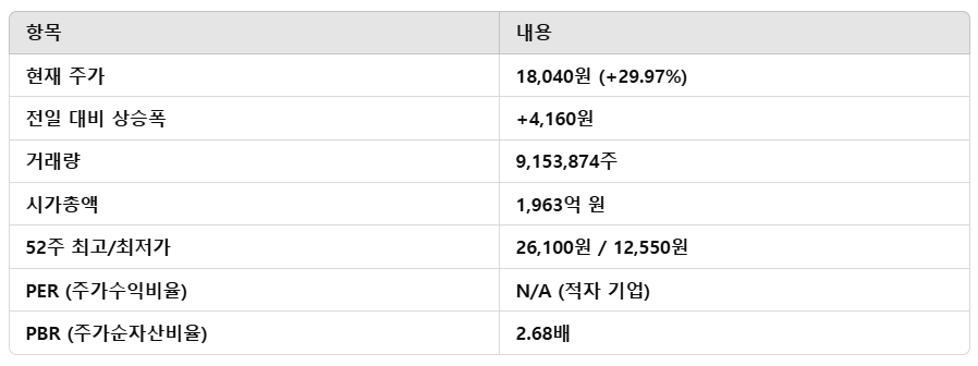 - 최근 하락세를 보이던 주가가 급등하며 저점 대비 40% 이상 반등