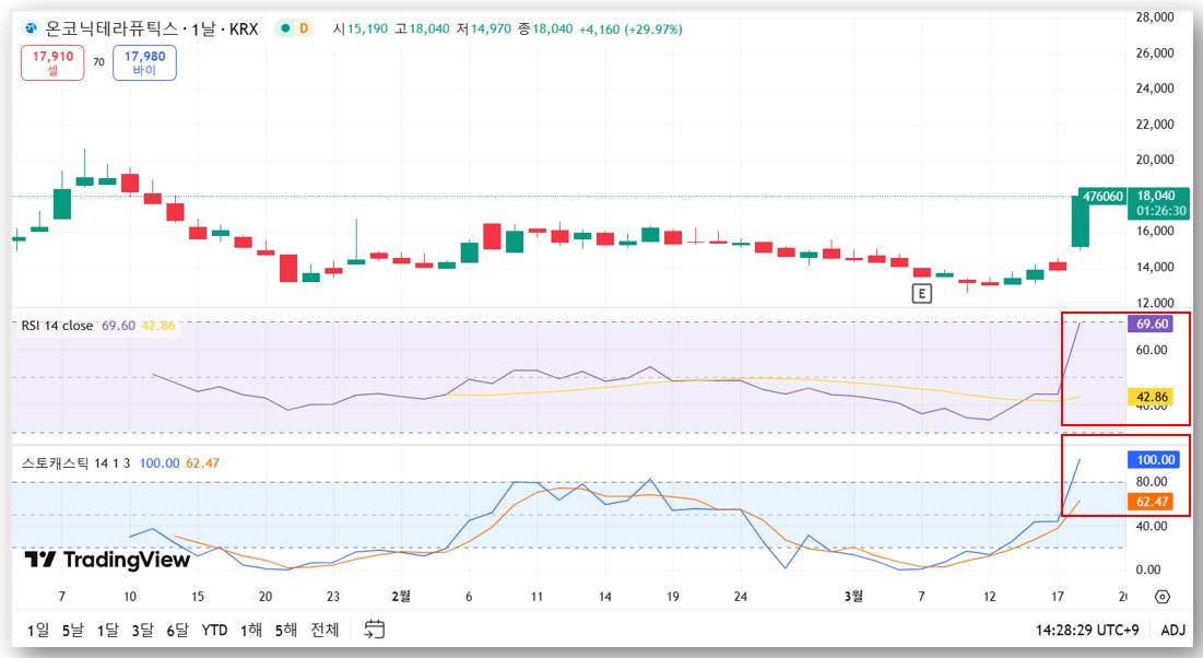온코닉테라퓨틱스의 주가가 3월 18일 상한가(+29.97%)를 기록하며 18,040원에 거래되고 있습니다.