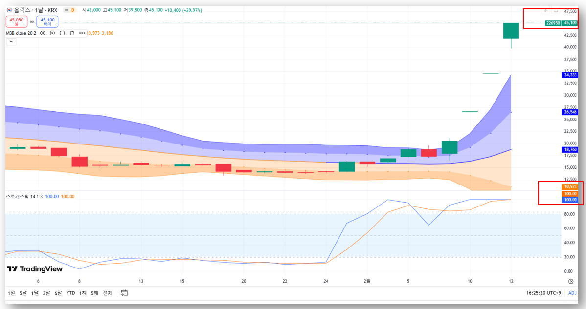- 스토캐스틱 100% 과매수 구간 진입 → 단기적 조정 가능성