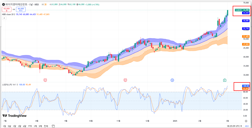 와이지엔터는 2025년 3월 4일 정규장에서 66,000원(+4.76%)을 기록하며 상승 마감한 데 이어, 애프터마켓에서도 6.98% 추가 상승한 67,300원을 기록하며 강세를 이어가고 있습니다.