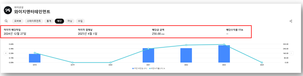 와이지엔터는 배당을 꾸준히 지급하는 기업은 아니지만, 최근 2년간 배당을 실시하였습니다.
