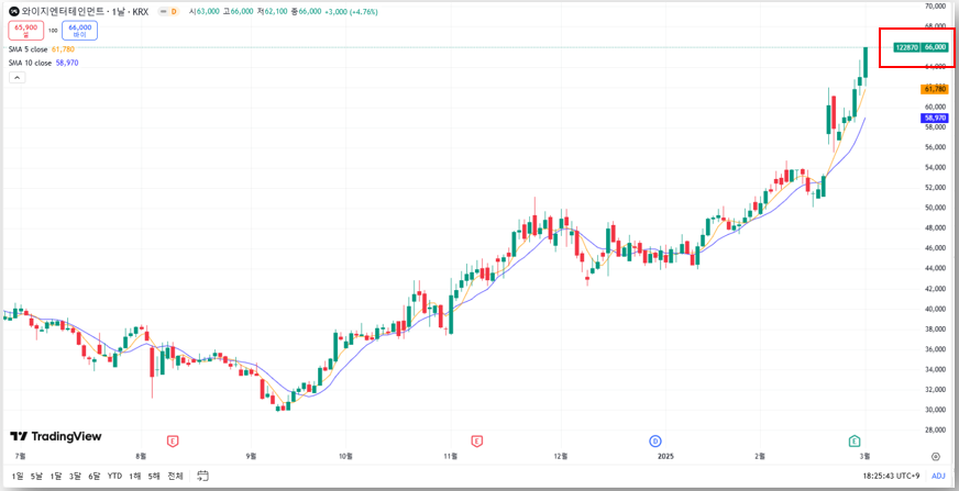 와이지엔터는 2025년 3월 4일 정규장에서 66,000원(+4.76%)을 기록하며 상승 마감한 데 이어, 애프터마켓에서도 6.98% 추가 상승한 67,300원을 기록하며 강세를 이어가고 있습니다.