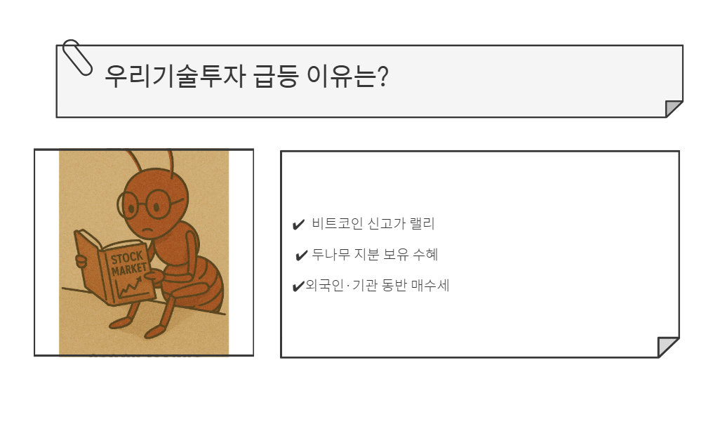 2025년 7월, 비트코인 강세에 힘입어 우리기술투자 주가가 연일 급등하고 있습니다.