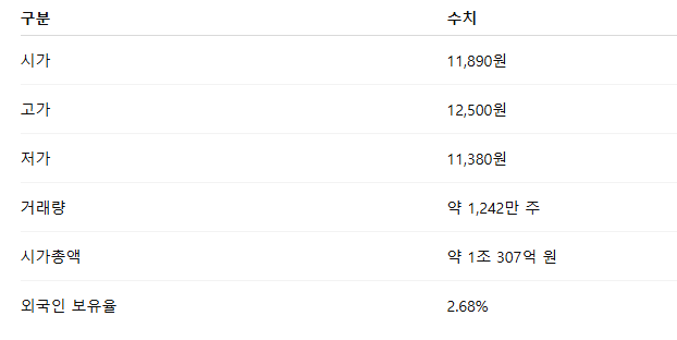 52주 최저가(5,460원) 대비 2배 이상 상승했으며, 최근 신고가 경신 흐름을 보이고 있습니다.